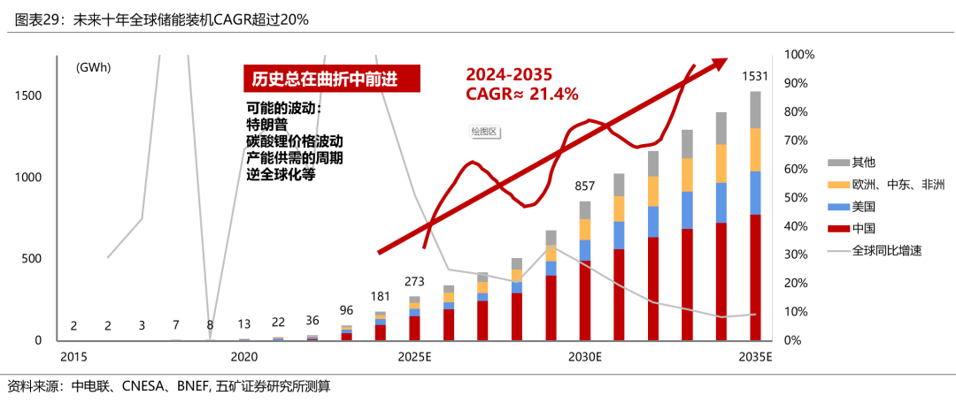 我们预计2035年全球新型储能年新增装机容量峰值有望超过1.5TWh,2024-2035年年化复合增速有望达到21.4%。