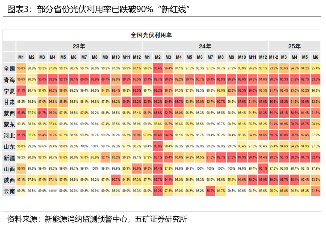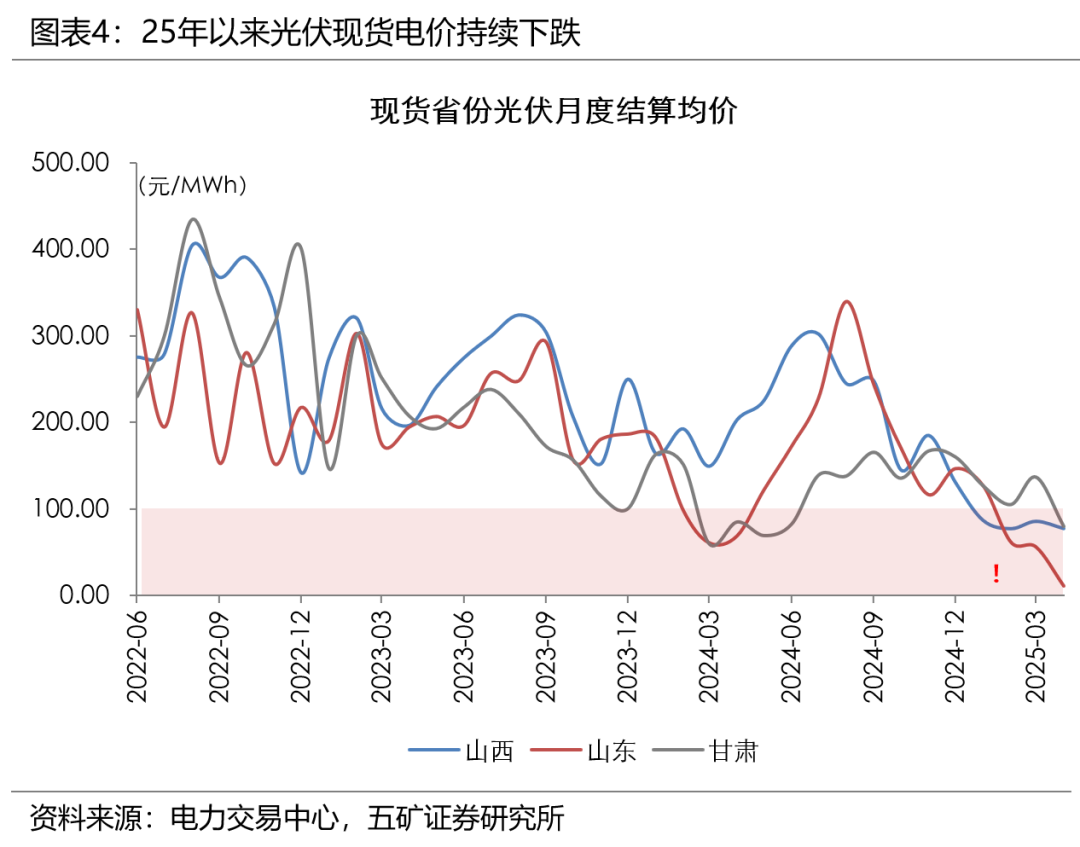 2025年以来中午时段现货市场“负电价”成为常态,多个现货省份光伏月均结算电价连续低于0.1元/kwh,我们认为现货电价更能反映目前光伏的“真实”消纳情况。