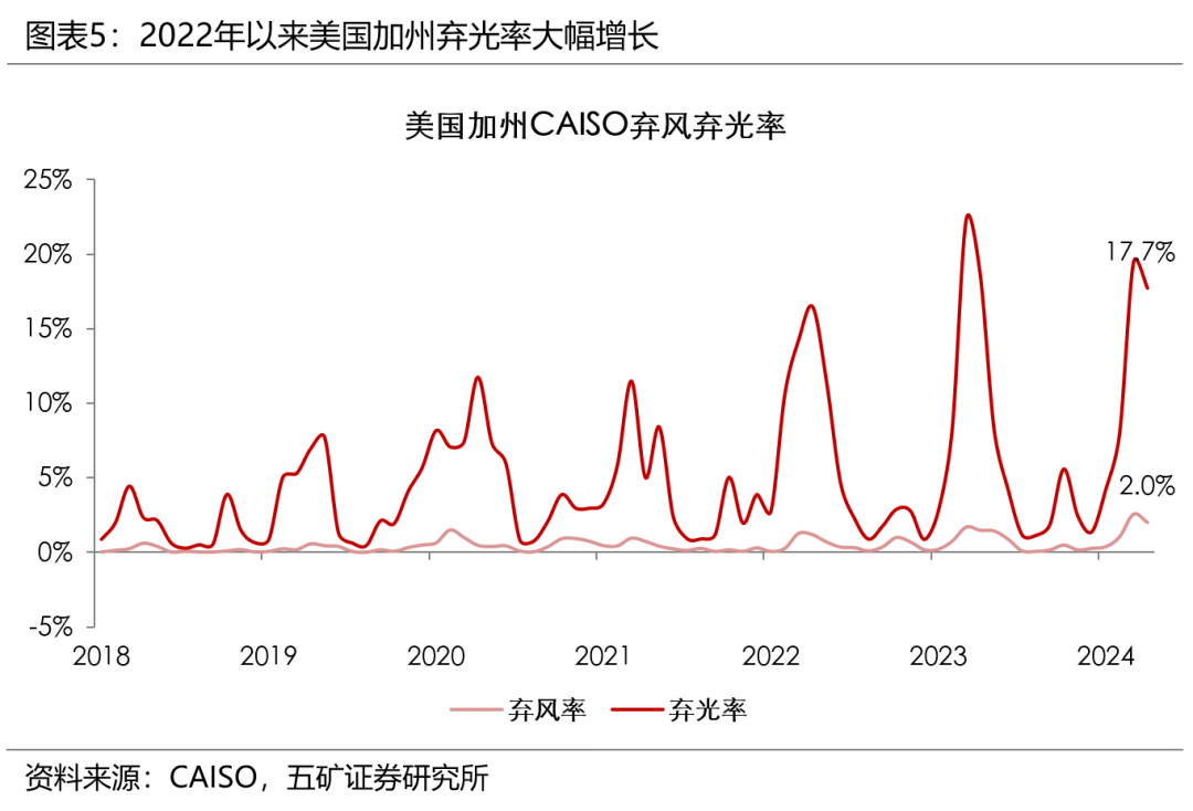 加州光照资源丰富,是美国能源转型步伐较快的地区,随着风光装机增长,美国加州地区出现了弃风弃光率大幅上升的情况。