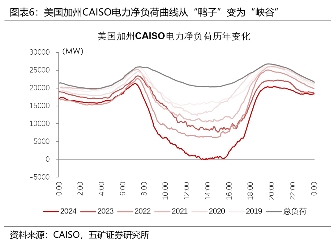 传统电源需要满足的调节需求被称为净负荷(净负荷=总负荷-风光出力),2024 年加州地区中午时段净负荷进一步下降,“鸭子曲线”正在演变成“峡谷曲线”,当电力系统净负荷低于0时,意味着仅风光出力便能满足该时刻所有用电需求。