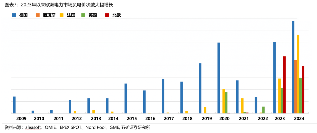 2024年欧盟整体风光发电量占比已经达到28.5%,部分国家占比更高,例如德国风光发电量占比达到了40.7%。受风光高渗透率影响,欧洲目前同样面临着愈发严峻的消纳问题,2023年以来欧洲电力市场各竞价区域出现负电价次数均大幅增长。