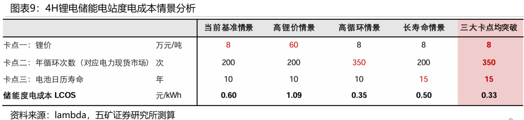 影响储能LCOS的三大关键变量分别是:锂价(对应随容量变化的装机成本)、年循环次数(对应电力现货市场)、电池日历寿命。