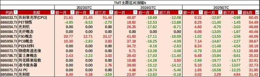 GTC大会对A股的影响力,是随着AI产业的爆发同步升级的。2022 年之前,大会的市场影响主要集中于海外科技板块,与A股相关标的联动性较弱。2023年ChatGPT出圈,AI产业化浪潮开启,算力需求指数级增长,GTC大会技术发布与产业链行情的联动性显著增强。复盘2023-2025年大会前后A股行情,可以发现,市场往往沿着这样的规律演绎:大多数情况下,AI相关板块都会在大会前1-2个月提前反应,资金提前布局博弈新技术发布的潜在催化。2023、2024年,通信、电子、传媒、计算机在会议结束前一个月均有较好表现;而大会落地后,市场将快速进入预期验证阶段,符合甚至超预期的主线行情具备延续性,不及预期的方向则大概率出现短期回调。数据来源:ifind,数据统计区间:2023年2月至2025年9月可见,拉长周期来看,相关标的能否落地实打实的业绩增长,是决定行情分化、个股能否走出持续趋势的核心分水岭。复盘历史走势可以发现,催化效应最明确、涨幅确定性最高的赛道,始终是英伟达芯片迭代直接带动的上游硬件配套产业链——无论是2023年引爆行情的光模块、CPO,还是后续轮番走强的液冷、PCB等细分领域,均是如此。其核心逻辑在于,芯片架构的代际升级,带动算力配套硬件的全面迭代,具备英伟达供应链准入资质的龙头企业,迎来了产品量价齐升的发展机遇。这类环节既直接受益于英伟达芯片出货量的持续增长,更能享受技术迭代带来的产品价值量提升,业绩兑现的确定性在整个 AI 产业链中处于领先位置。数据来源:ifind,数据统计区间:2023年2月至2025年9月2023年GTC大会:英伟达发布针对大模型训练优化的H100 GPU、DGX Cloud AI超级计算服务,为AI算力产业化落地提供了核心支撑,进一步强化了市场对全球AI算力需求增长的预期,大会落地后,市场主线从泛AI主题炒作向算力硬件环节聚焦。光模块龙头中际旭创会后3个月涨幅超200%,天孚通信、新易盛等光通信标的,以及沪电股份、工业富联等产业链企业均实现显著涨幅。数据来源:ifind,数据统计区间:2023年2月至2025年9月,以上个股不做推介2024 年GTC大会,英伟达发布全新Blackwell架构及B100/B200 GPU,AI 推理性能较上一代Hopper架构实现大幅提升。此时市场已经出现结构性分化,尽管TMT整体板块出现调整,但核心公司会后3个月延续强势表现,新易盛、景旺电子、胜宏科技、中际旭创等均实现超10%涨幅。英伟达自身股价也凭借 Blackwell 架构的订单落地,2024年3月-10月累计涨幅超150%。数据来源:ifind,数据统计区间:2023年2月至2025年9月当大会发布的技术路线、产业规划超出市场前期预期时,对应的细分赛道往往会打开全新的增量市场,走出更强的行情弹性;而核心内容基本符合市场预期时,则容易引发 “买预期、卖事实” 的短期调整。2025 年英伟达举办了春秋两场GTC大会,市场对 “预期与兑现” 的定价逻辑体现得更为充分。其中,2025年3月春季GTC大会,核心发布Blackwell Ultra芯片,同时公开了未来四年三代GPU架构路线图,明确了技术迭代节奏。由于核心发布内容基本符合市场前期预期,出现了 “利好兑现” 的短期波动,英伟达当日股价下跌 3.43%,A 股相关板块同步回调,部分 PCB 标的当日跌停。但从中长期来看,AI 算力产业的高景气趋势未发生改变,会后 6个月内,光模块、光纤、PCB、液冷等赛道核心标的,仍实现了显著的超额收益。本届 GTC 大会,正处于AI产业从“训练规模扩张” 向 “推理规模化商用” 转型的关键节点。此前黄仁勋已对外预热,本次大会将发布 “令世界震惊的芯片” 与重磅技术成果。结合当前市场一致预期与机构研报研判,本届大会的核心看点与对应受益赛道主要集中在四大方向:目前大家所熟知的英伟达GPU主要是GB200、GB300,都是基于当前的Blackwell架构,是目前(2024-2025年)英伟达的主流产品。而Rubin则是英伟达即将推出的下一代架构,定位顶级AI基础设施,据称Rubin的算力为GB300的3.3倍,支持单卡运行GPT-4级万亿参数模型,训练时间从3个月压缩至2周。市场普遍预计,本次大会将披露 Rubin Ultra 高功率 GPU 的核心参数与量产计划,同时前瞻发布基于台积电1.6nm先进制程的Feynman架构技术路线图,还将揭晓整合Groq LPU技术的全新AI推理芯片方案。对应受益赛道:半导体芯片全产业链,包括芯片设计、先进封装、HBM/HBM4存储、SRAM、半导体设备与材料,同时将对国产半导体替代主线形成直接催化。2026年被英伟达定为“硅光子商用元年”,叠加此前英伟达向光电子龙头 Lumentum、Coherent 合计40亿美元的战略投资,市场对CPO技术的规模化落地预期较强。本届大会,英伟达预计将正式发布 Quantum X3450 CPO交换机,落地 Scale-up 域光入柜内方案,有望实现带宽翻倍、系统功耗降低30%-50%的核心突破,推动数据中心高速互联技术的全面迭代。对应受益赛道:光通信板块,包括 CPO 光模块、硅光芯片、光无源器件、高速连接器、高速 PCB 等细分赛道,该赛道也是历届 GTC大会中市场敏感度最高、行情弹性最强的核心方向。创业板人工智能ETF华夏(159381):跟踪指数的一半权重集中在光模块CPO板块,另一半权重覆盖AI软件应用领域,形成“硬件 应用”的均衡布局。前10大权重股为中际旭创(13.23%)、新易盛(12.67%)、天孚通信(10.18%)、润泽科技、蓝色光标、协创数据、昆仑万维、北京君正、网宿科技、润和软件。目前基金规模近20亿元,场内综合费率仅0.20%,为同类最低。场外联接(A类:025505;C类:025506)。$创业板人