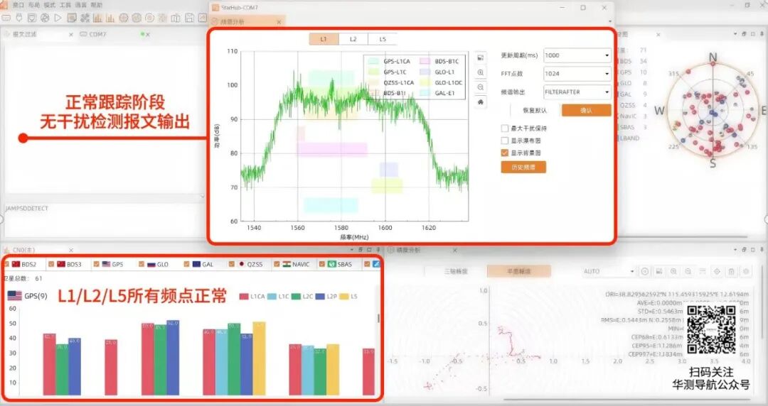 客户反馈的充电桩实际干扰场景测试,A720准确识别出了扫频干扰类型和干扰强度,并在此干扰场景下保持了固定解状态,且轨迹连续、精度正常,表现出了强大的抗干扰能力。
