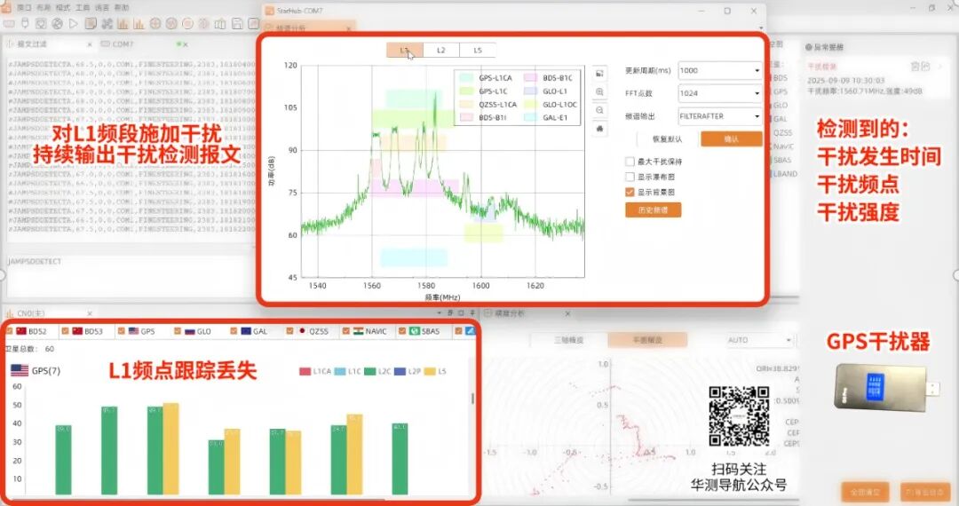 使用车载“点烟器式”GPS干扰器进行抗干扰测试,在A720正常运行过程中,开启干扰器,A720能够实时输出干扰检测报文,并准确地识别出干扰的类型、作用的频点和干扰型号的强度,为下游应用提供了可靠性的先验信息。