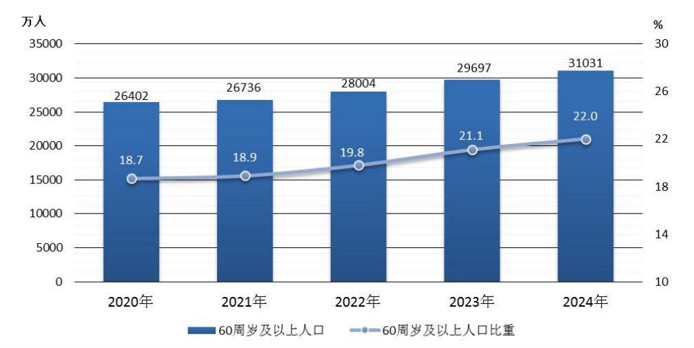 图1:2020-2024年60周岁及以上老年人口及其占全国总人口比重
