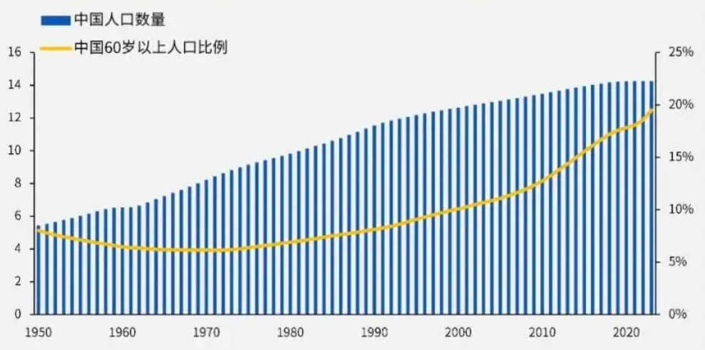 图2:中国人口数量及60岁以上人口比例(亿人;%),1950-2023