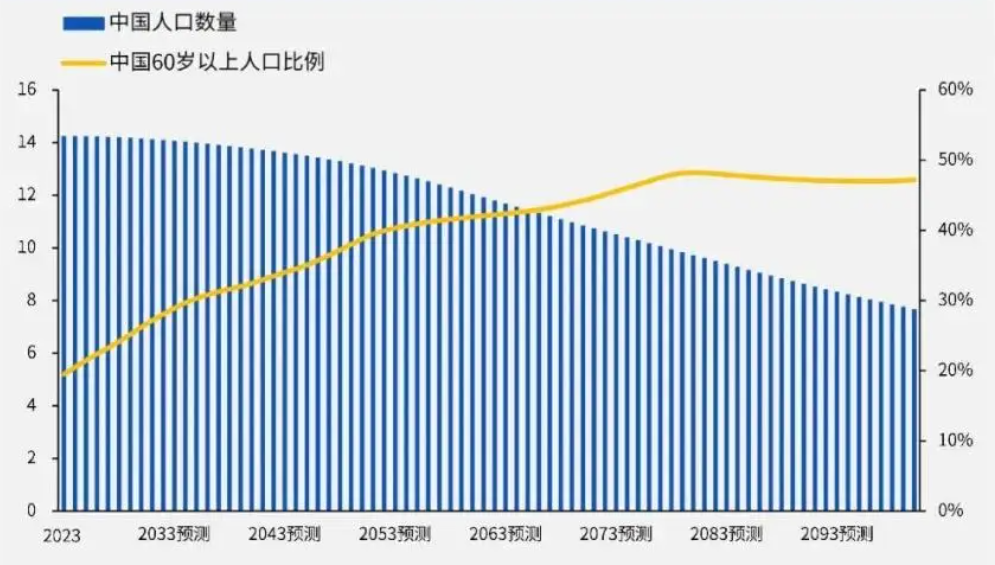 图3:中国人口数量及60岁以上人口比例(亿人;%),2023-2100预测
