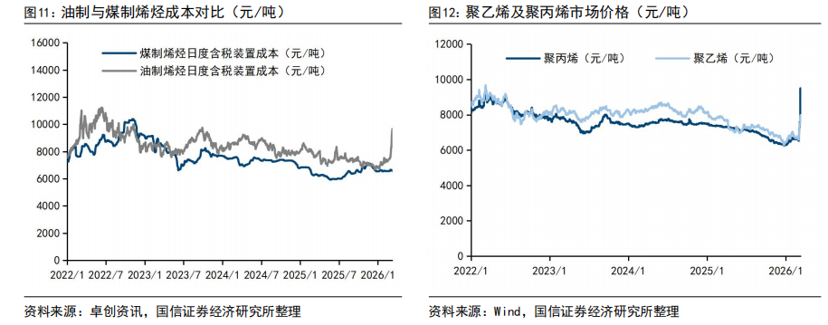油煤价差持续走扩。受美伊冲突冲击,原油价格大幅上涨,布伦特原油接近100美元/桶,同期煤价较为稳定,油煤价差走扩。据卓创资讯,截至2026年3月10日,煤制与油制烯烃平均成本6573/8777元/吨,煤制烯烃成本优势扩大至2204元/吨,高油价下成本优势显著凸显。