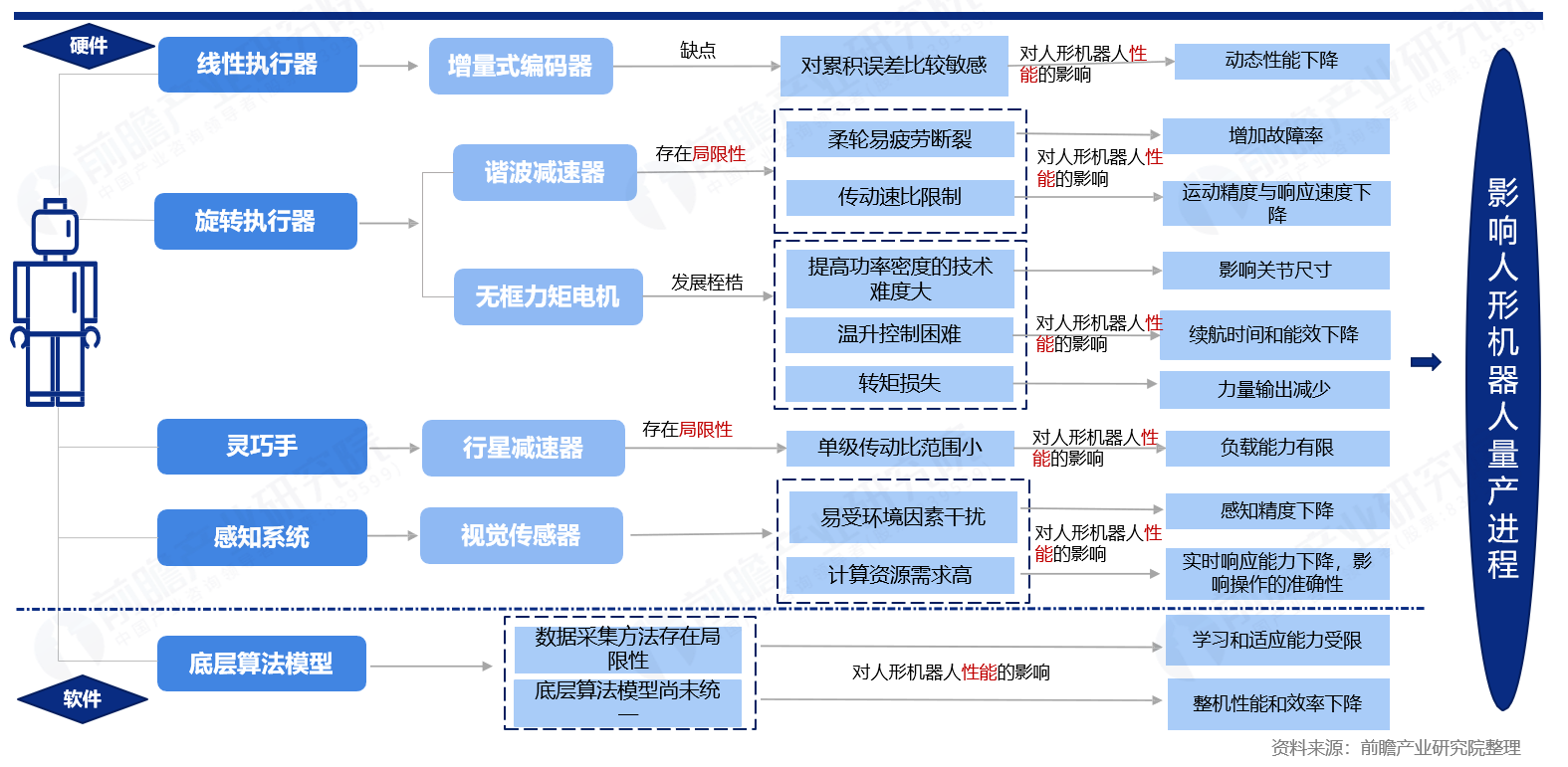 技术挑战四:数据采集方法的局限性影响学习与适应能力从底层算法模型来看,机器人的软件可以分为大脑与小脑。目前大小脑发展不均衡,相较于智能‘大脑的智力快速提升,人形机器人的小脑即运动控制,发展停留在初期,主要制约因素之一是数据采集直接影响到了人形机器人的学习和适应能力,对实现大规模量产构成了障碍。