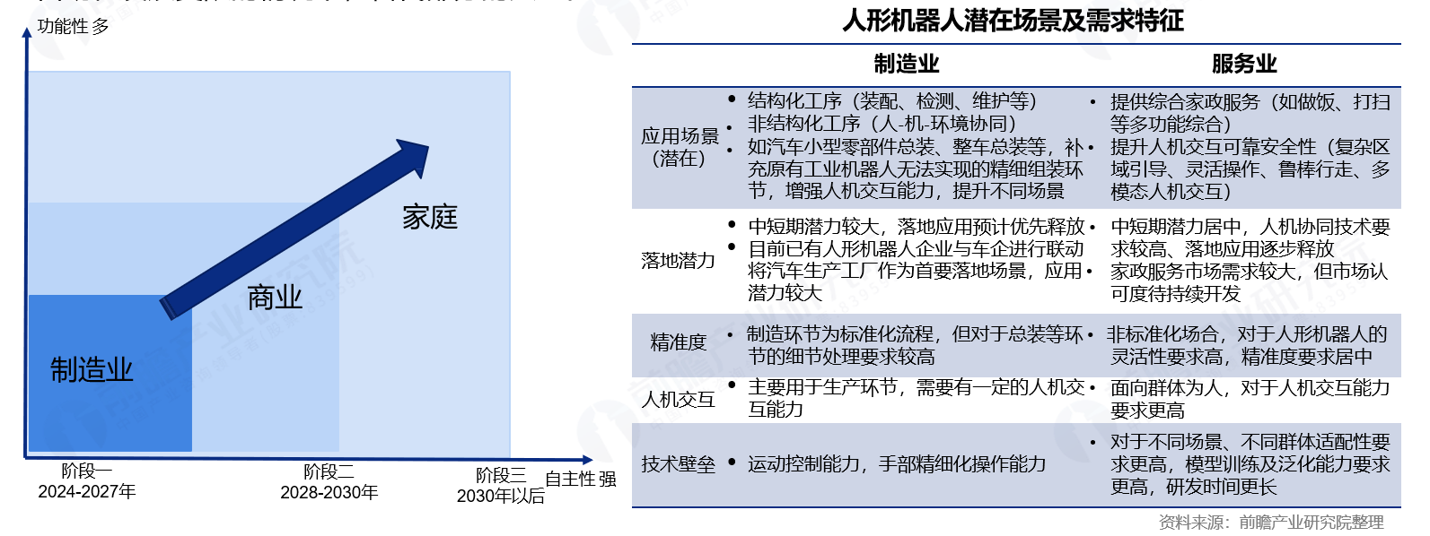 人形机器人行业应用场景:人形机器人在细分市场率先商业化,如工厂生产、安防巡检、物流配送、服务业引导等,初期功能单一,后逐步成熟转为通用型机器人,由ToB转为ToC,进入家政等市场;更远的未来,人形机器人有望应用于航天航空领域。专用型向通用型。