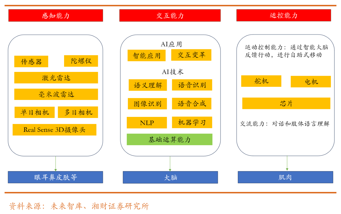 人形机器人空间巨大。从需求侧看劳动力供给将面临短缺,用机器人代替人成为不可逆趋势;从供给端看,以ChatGPT为代表的AI大模型不断迭代,使人形机器人应用场景进一步拓宽。人形机器人在短期内有望首先突破工业制造、商用服务等B端场景, 中长期可能逐步突破极端作业、家用服务等更为复杂的场景。只有当人形机器人突破C端家用等应用场景后,市场空间才会真正全面打开。环境感知模块、运动控制模块和人机交互模块是人形机器人的发展核心,从发展路径看,人形机器人发展趋势将遵循从硬件驱动到软件驱动的发展规律。