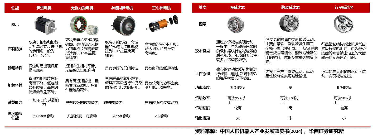 电机:电机是机器人的“心脏”,高效率、高动态、高功率密度是关键要求,不同类型电机适用于不同场景,国内企业在技术创新和性能提升方面持续努力,但与国外高端产品仍有差距,有望进一步提升国产份额。
