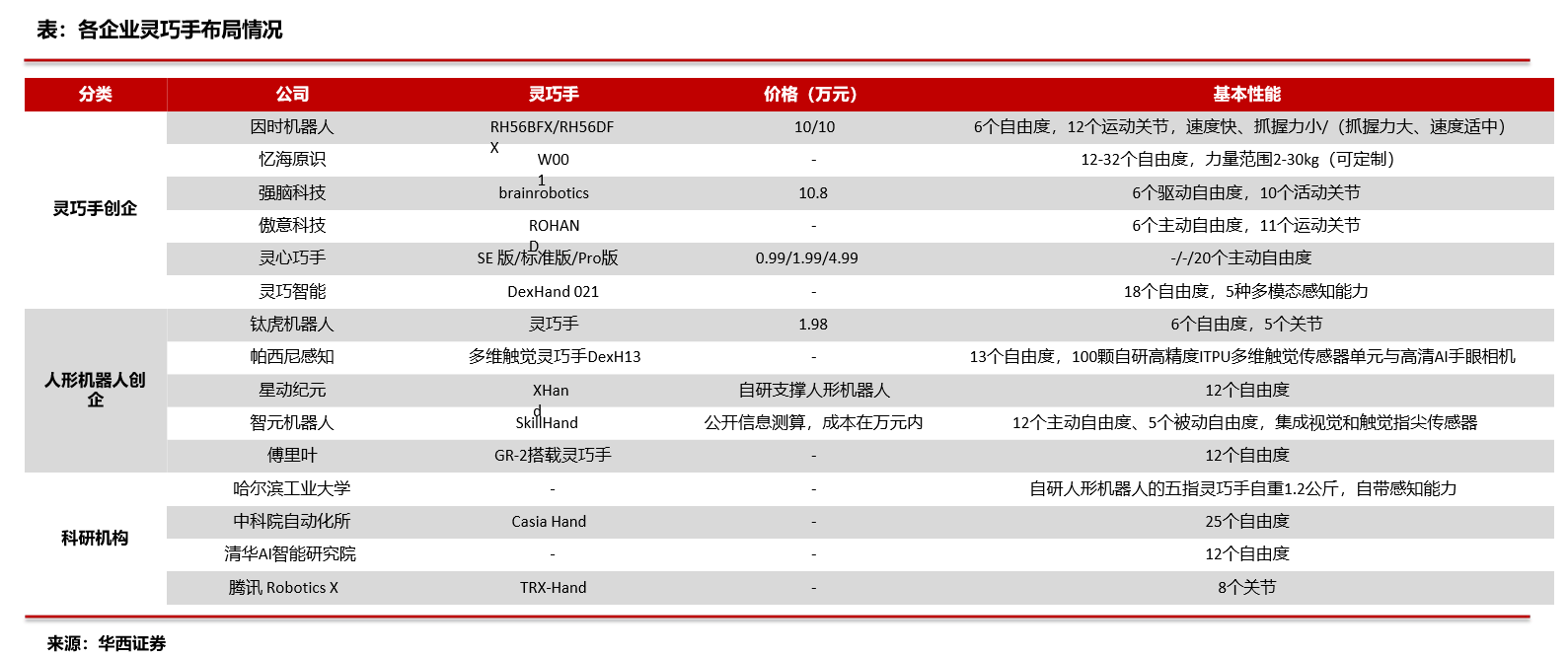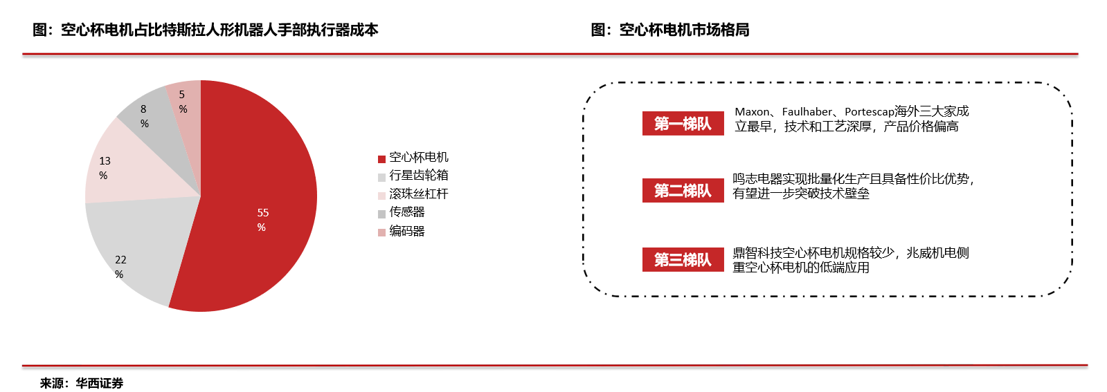 电机驱动是多指灵巧手的主要驱动方式,具有驱动力大、控制精度高、响应快、模块化设计、易于更换维护等优点。空心杯电机是灵巧手关键零部件。特斯拉2023年生产一款名为擎天柱Optimus的人形机器人,空心杯电机占单台机器人成本的4.43%; Optimus单手有11个自由度,采用6个执行器,采用空心杯电机 蜗轮蜗杆 金属肌腱驱动的方案,空心杯电机占手部执行器成本的54.5%。从竞争格局看,海外厂商Maxon、Faulhaber等技术工艺深厚,目前仍处于第一梯队,但鸣志电器等国产厂商逐步实现批量生产,且具备性价比优势,国产替代在望。