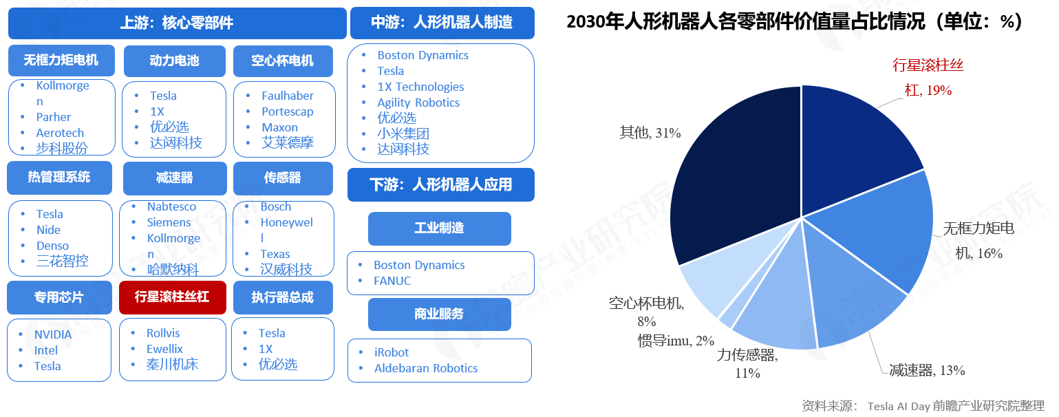 人形机器人产业链上游为核心零部件,其中行星滚柱丝杠价值量占比较高。行星滚柱丝杠制造难度大、壁垒高,目前产能主要集中于欧洲、美国等,中国企业起步较晚,规模较小,国内市场主要依靠海外进口。