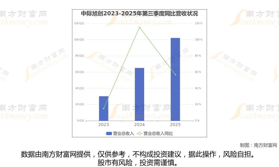 在2025年第三季度,中际旭创的业绩表现(如上图),主营业务收入达到102.16亿元,实现了56.83%的同比增长率。