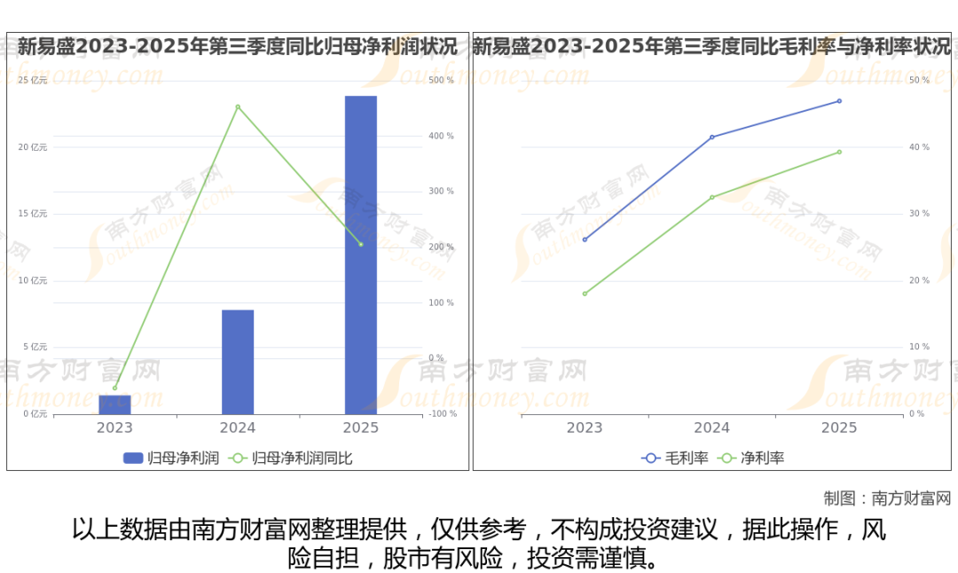 2025年第三季度季报显示,新易盛公司实现净利润23.85亿,同比上年增长率为205.38%,毛利率46.94%,归属净利润23.85亿,同比增长205.38%。
