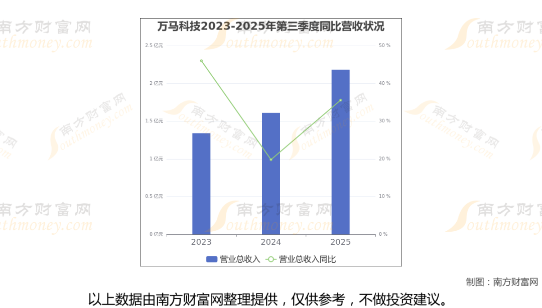 于2025年第三季度,万马科技披露了其业绩表现(如上图),其中主营业务收入2.18亿元,相较于去年同期35.56%。