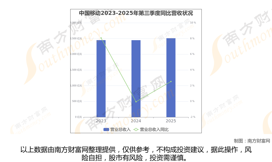 中国移动2025年第三季度报告显示(如上图),公司实现主营业务收入2508.97亿元,较去年同期增长2.53%。
