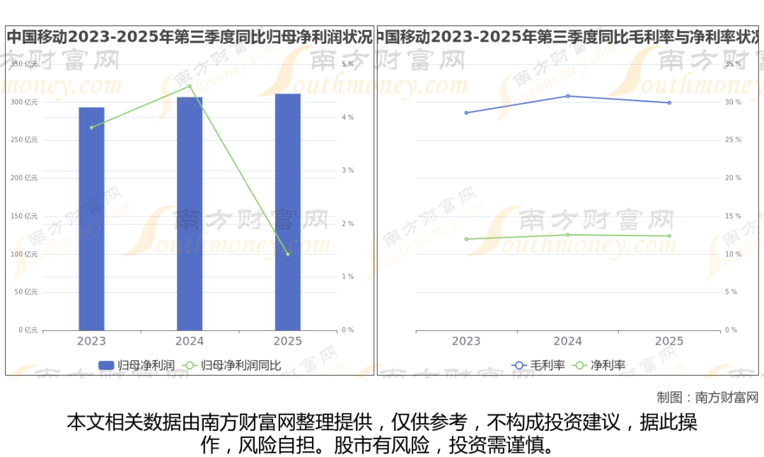 2025年第三季度季报显示,中国移动公司实现净利润311.18亿,同比增长1.43%;毛利润为751.13亿,毛利率29.94%。