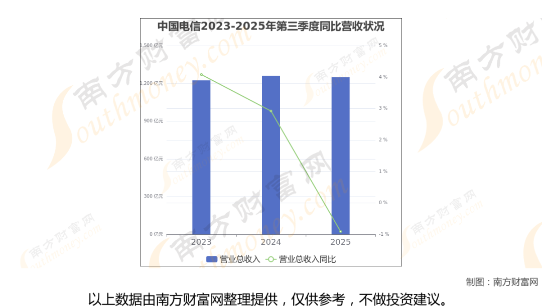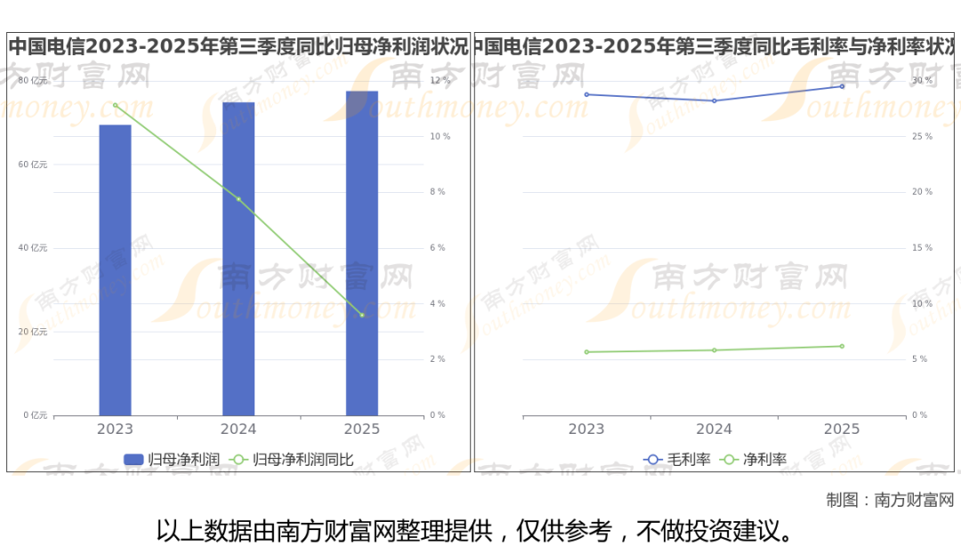 2025年第三季度季报显示,中国电信公司毛利率29.5%,净利率6.21%,归属净利润77.56亿,同比增长3.6%。