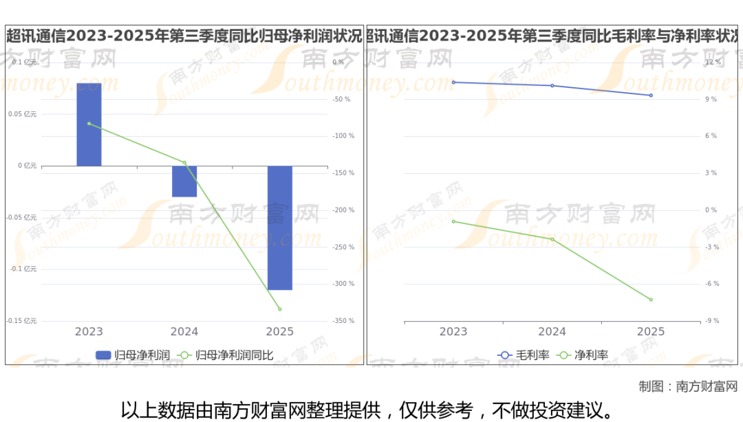 2025年第三季度季报显示,超讯通信公司毛利率9.33%,净利率-7.26%,归属净利润-1221.62万,同比增长-333.95%。