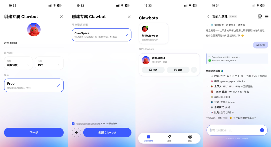 随着AI智能体软件OpenClaw爆火,过去一周,“养龙虾”热潮从科技圈蔓延至网民,互联网企业也纷纷推出自家“龙虾”产品。3月13日,阿里云宣布推出“一键养虾”平台JVS Claw。阿里云介绍,该产品无需消费者了解代码知识,通过手机上的三步简单操作,便可装上AI智能体“龙虾”,全程无需配置节点和大模型API密钥,也不用绑定微信或飞书等即时信息软件。阿里云介绍,JVS Claw是基于OpenClaw架构深度定制的AI助理解决方案。相比OpenClaw,JVS Claw运行更安全,由于AI的所有操作在云端隔离环境中完成,可以避免病毒入侵本地或误删本地文件。在使用方式上,该产品内置即时通讯功能,可实现“聊天即指令”。功能方面,JVS Claw能帮助用户实现自动化办公,如自动登录网页后台、抓取数据、生成Excel报表、定时发送日报。此外,还可进行软件开发辅助、竞品分析、全天候客服或监控等工作。阿里云网站显示,JVS Claw支持iOS和Android手机端,以及网页端和Pad端多端访问,并提供了一个自进化的“万能skill”,用户只需要说“如果没有这个技能,请搜索并创建”,智能体就会寻找最合适的skill并完成任务。此外,JVS Claw支持用户实时查看智能体的每一步操作状态,若遇到了登录账号等操作卡点,用户可随时介入手动修正,保证操作全程可控。云端“养龙虾”虽具备消耗低、安全隔离等优势,但用户常需调用本地数据解决具体需求。针对不同使用场景,JVS Claw支持云端、本地双模式自由切换。关于未来规划,阿里云表示,JVS Claw计划上线多OpenClaw接入功能,将本地Mac Mini等各类部署方式统一接入平台,打破不同AI智能体间的交互壁垒。此外,平台还将新增群聊协作功能,用户可在JVS IM群组中邀请多个AI成员,实现智能体的分工协作。目前,阿里云JVS Claw已上架苹果商店App Store和各大应用商店,首批PC用户可获得7日大模型免费调用量。对于安全风险,JVS Claw提前进行防范。阿里云相关负责人表示,JVS Claw采用金融级数据安全标准,通过数据隔离、传输加密、落盘加密、权限最小化等方式,防范数据泄漏风险。具体而言,平台为每个用户分配独立的容器化云端运行环境,实现与其他用户的物理或逻辑隔离,确保数据互不干扰。在通信与存储环节,平台内的所有通信均采取端到端加密,云端存储卷默认加密,即使物理硬盘被盗也无法读取数据。此外,JVS Claw遵循最小权限原则,默认禁止访问用户本地局域网或个人电脑文件,仅在用户主动上传或授权挂载目录时才开放权限。JVS Claw严格遵循“零知识”原则,用户的JVS IM聊天记录与云电脑操作日志均存储在私有实例中,官方无法查看,切实保障用户数据安全。针对中小企业用户的安全需求,JVS Claw同样进行了针对性设计,以防范云端AI执行恶意操作波及企业内网。阿里云相关负责人介绍,ClawSpace云端环境默认采用“出站受限”模式,仅允许访问公开互联网进行资料检索,默认禁止主动连接企业内部服务器或局域网。如需访问内网资源,需用户手动配置授权,从而有效隔离风险。“养虾”热潮已经成为2026年智能体落地应用浪潮的开端。近期,深圳龙岗、江苏无锡高新区先后发布支持OpenClaw发展的若干措施(征求意见稿),以“智能体”的部署为契机,推动智能经济发展。艾媒咨询分析师认为,OpenClaw的快速破圈,不仅验证了代理式AI的市场潜力,也推动其进入规模化落地前夜。只有在技术能力、生态建设与风险治理上同步突破,才能真正释放AI智能体的生产力价值,引领全球AI产业从交互创新向自主执行深度演进。