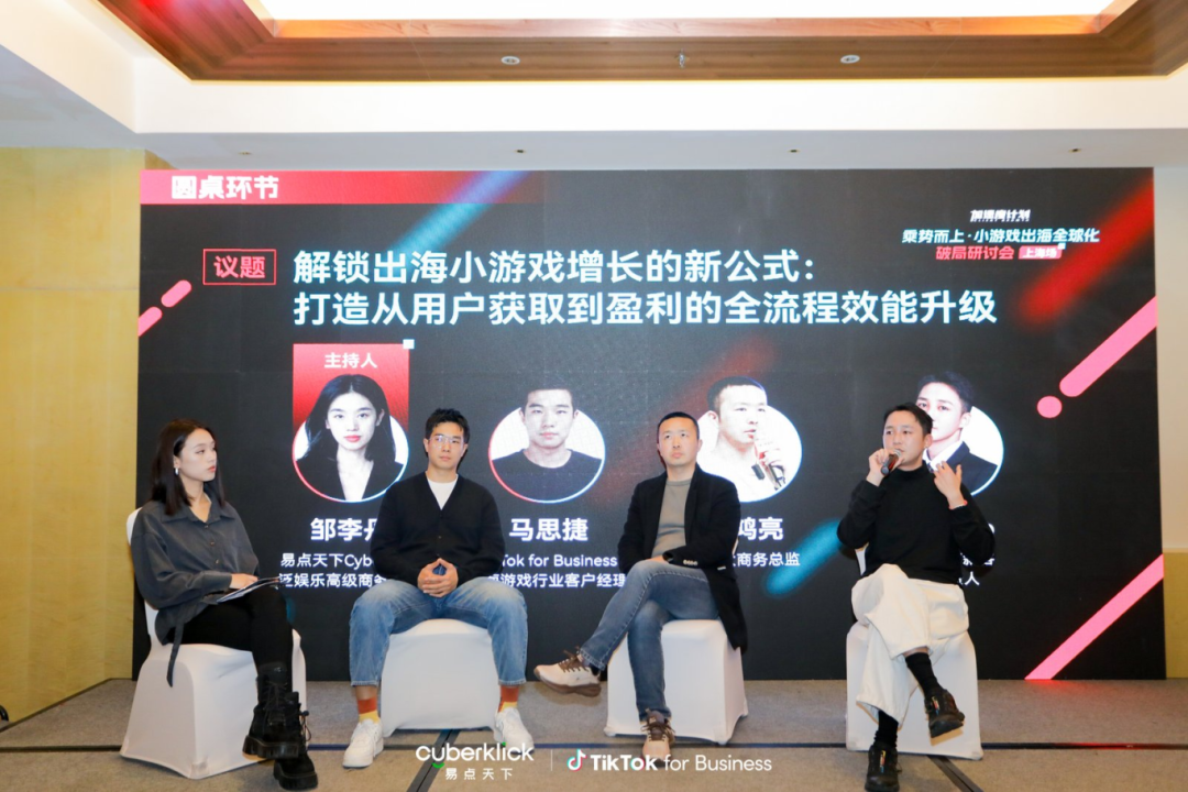 12 月 23 日下午,由易点天下 Cyberklick与TikTok for Business联合主办,Adjust、广大大、中国广告主协会品牌出海工作委员会特别支持的「加速度计划——乘势而上·小游戏出海全球化破局研讨会」在上海顺利举办。活动汇聚了众多游戏行业从业者,围绕小游戏出海过程中的机遇与挑战,通过主题分享与互动交流,深入探讨 IAA 游戏出海的增长新路径。