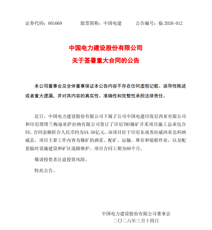 近日,公司下属子公司中国电建印度尼西亚有限公司和印尼塔塔兰梅迪亚萨拉纳有限公司签订了印尼TMS镍矿开采项目施工总承包合同,合同金额折合人民币约为54.56亿元。该项目位于印尼东南苏拉威西省北科纳威县。项目主要工作内容为镍矿的剥采、配矿、运输、堆存和装船作业,以及配套临时设施建设和矿区道路维护。项目合同工期为60个月。