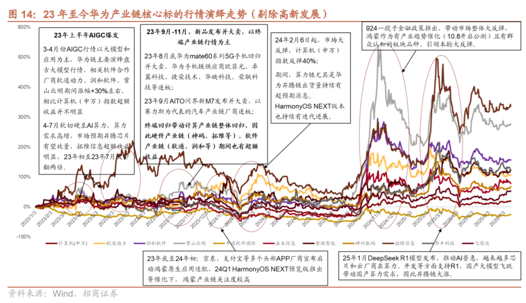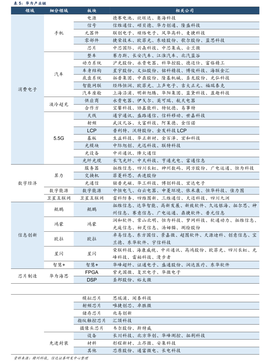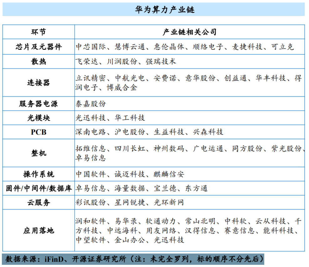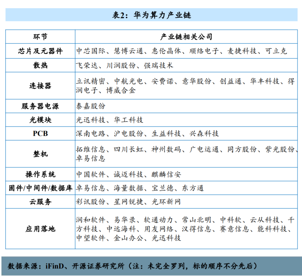 华为链:鸿蒙链标的软通动力、智微智能、亚信安全、常山北明、润和软件、法本信息等;华为昇腾链标的神州数码、软通动力、拓维信息、高新发展、华丰科技、飞荣达等。