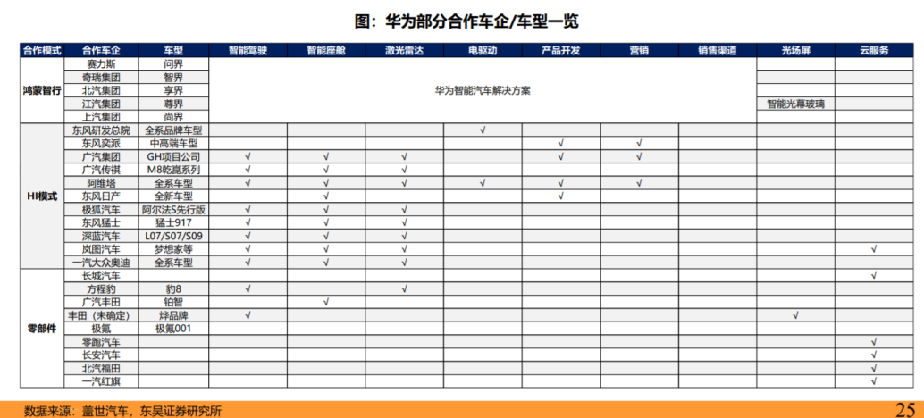 鸿蒙智行品牌相关的上汽集团、赛力斯、北汽蓝谷、江淮汽车以及奇瑞汽车相关产业链,拥有华为合作车型的长安汽车、东风集团股份。