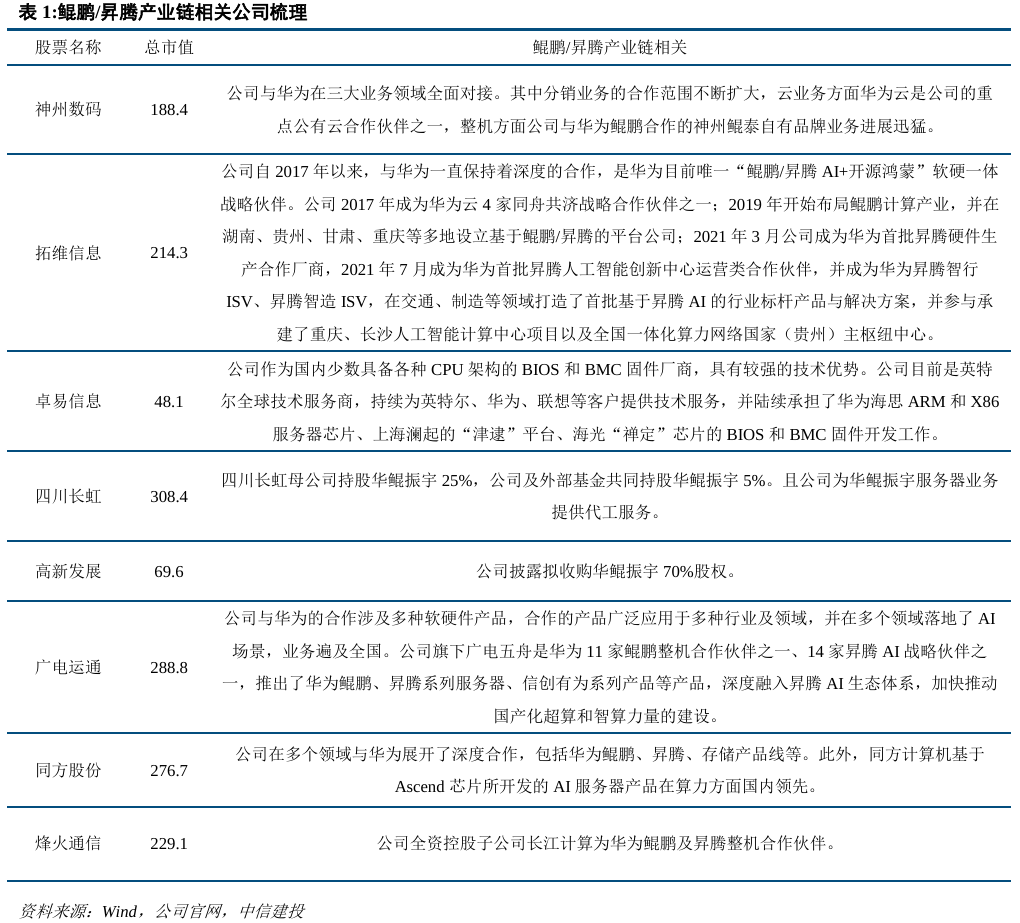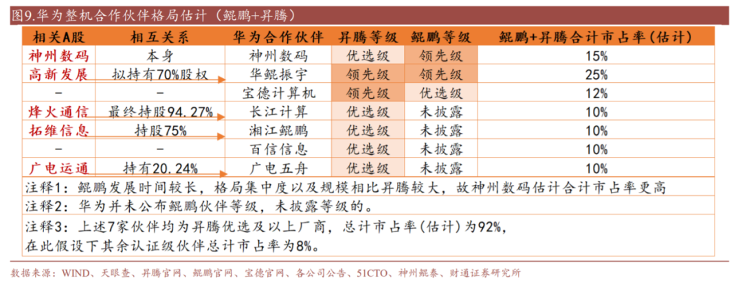 整机合作伙伴:神州数码(昇腾优选级、鲲鹏领先级合作伙伴)、拓维信息(昇腾优选级合作伙伴)、烽火通信(子公司长江计算为昇腾优选级合作伙伴)、广电运通(子公司广电五舟为昇腾优先级合作伙伴)、四川长虹、紫光股份;