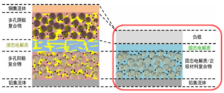 准固态电池:在全固态电池中加入少量液态电解液(通常小于5wt.%)的情况下得到的。液态电解液的作用主要是浸润界面。全固态电池:与液态电池相比取消了原有的电解液,采用固态电解质,并以薄膜的形式分隔正负极,从而替代隔膜的作用。