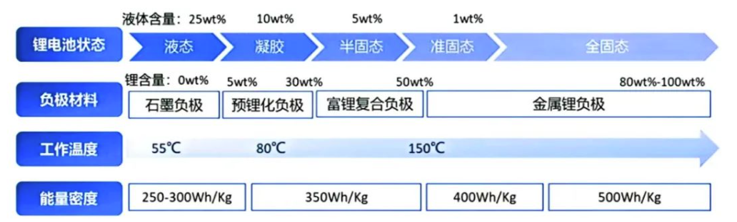 负极从石墨体系升级到预锂化的硅基负极/锂金属负极,正极从高镍升级到了超高镍/镍锰酸锂/富锂锰基等。全固态电池的能量密度可达500Wh/kg。