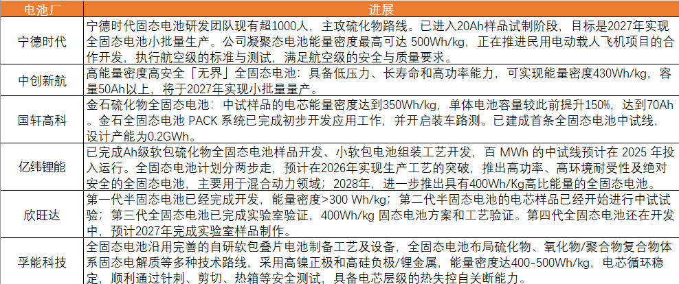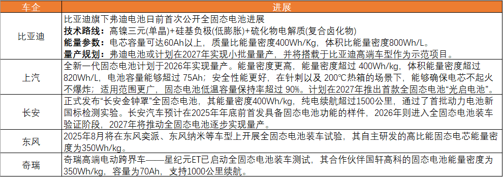 国内主流车企固态电池布局加速:广汽 2026 年昊铂搭载硫化物全固态电池(400Wh/kg);比亚迪 2027 年示范装车 60Ah 电池(400Wh/kg);