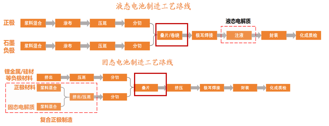 固态电池多采用叠片工艺。液态电池极片一般用卷绕或者叠片的方式组合(方形多卷绕),而固态电池由于其固态电解质如氧化物和硫化物韧性较差,通常使用叠片形式。