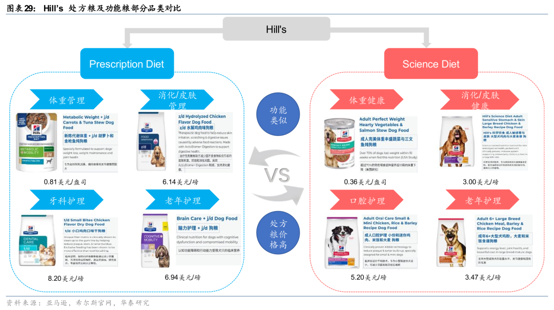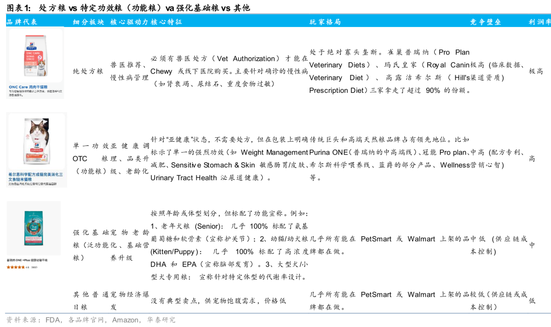 为了方便分析,我们将广义上的功能粮分为处方粮“prescription diet food”、特定功效粮“Condition-Specific OTC”、强化型基础粮“Fortified Life stage”及其他普通粮四类,在本文中,我们针对前两者进行重点分析。处方粮因其渠道及研发壁垒深厚,为最特殊、最顶级的功能粮;特定功效粮通常具备更强烈的单一营养功效,比如体重管理、毛发健康、肠道健康以及泌尿健康等,不需处方就可以开具,有些类似“轻处方粮”的概念,主要用于预防保健,典型品牌代表是Hill’science diet、雀巢冠能pro plan等,这是本文重点讨论对象,我们在下文中代称为功能粮。而强化型基础粮更像是添加了特定成分的“功能性升级”,比如分生命阶段粮、分品种粮,为泛功能粮,几乎所有品牌都可以做,玛氏皇家为典型代表。