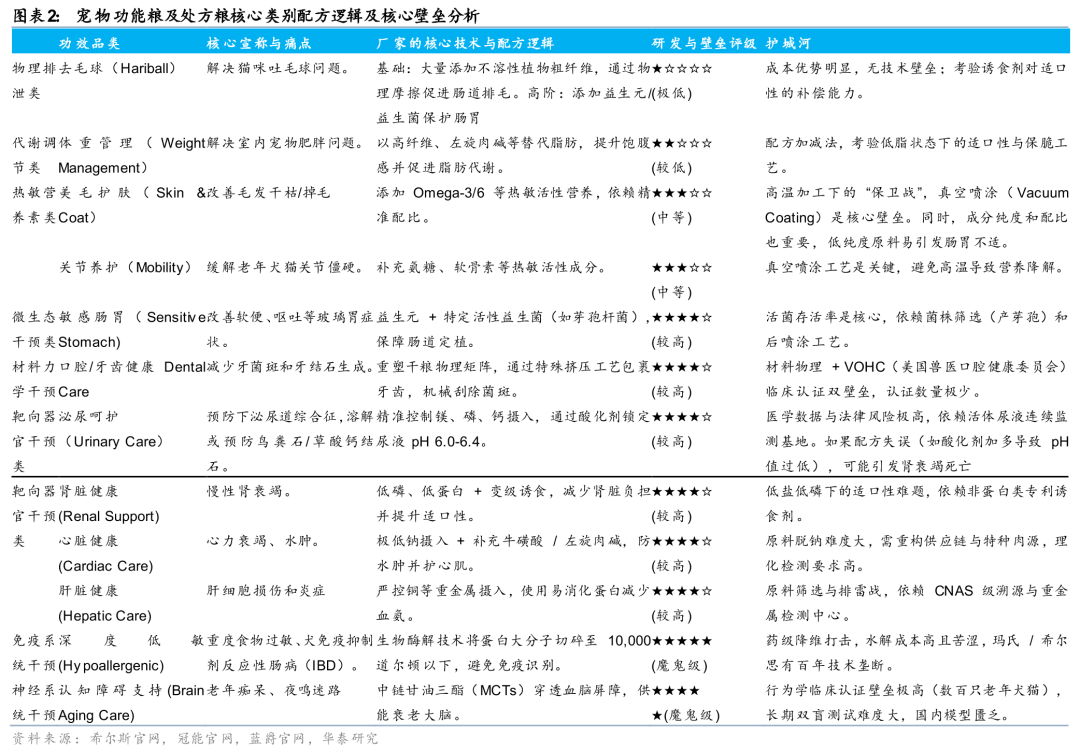 结构拆分:功能粮的类型主要分为化毛球、体重管理、美毛护肤、关节养护、肠胃健康、泌尿呵护,口腔健康等7大类。处方粮还包括肾脏、心脏、肝脏健康以及深度低敏、认知障碍支持等技术壁垒更高的类别。1)物理化毛、代谢体重管理等低壁垒品类依赖粗纤维等常规原料,配方可复制性强,竞争格局分散,企业需在适口性、原料添加等方面形成差异化;2)美毛护肤、关节养护等中等壁垒品类,核心在于热敏活性成分的稳定添加与真空喷涂工艺,对生产设备与技术积累要求较高;3)敏感肠胃、口腔护理、泌尿健康等高壁垒品类,依赖特定菌株筛选、特种材料与精准 pH 控制技术,且需通过严格临床验证,行业准入门槛高。除此之外,处方粮内的肾脏、心脏、肝脏健康以及深度低敏、认知障碍支持粮,涉及钙磷比、生物酶解、中链甘油三酯等前沿技术,且需通过长期双盲试验,技术垄断性极强,仅少数国际巨头具备布局能力。结构上来看,体重管理和肠胃健康是两大热门方向。据GMI数据,2024年美国处方粮规模共18.4亿美元,其中体重管理占比最高,为23.0%,胃肠道健康其次,为20.5%。宠物功能粮赛道的竞争,本质上是配方技术、工艺壁垒与功效验证能力的综合比拼。不同功效品类的技术护城河差异显著,决定了行业的竞争格局与盈利空间。