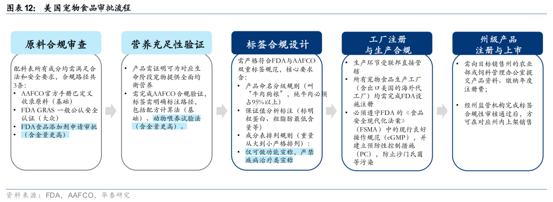 美国宠物食品审批流程复杂且监管追溯流程严格,GRAS认证以及AAFCO动物喂养试验是考验美国宠物食品研发的终极壁垒,以上在一定程度避免了美国功能粮的大规模泛滥。美国宠物食品的审批和监管体系与人类食品或药品的“集中审批制”不同,它是一个“联邦与州双重监管,且高度依赖行业协会标准”的复合体系。严格来说一款普通的美国宠物食品在上市前不需要获得FDA的直接“上市批准文件”(除非它宣称能治病,从而被归类为兽药),但它必须走完一套严密的合规与注册流程。共分为原料合规审查、营养充足性验证、标签合规设计、工厂注册与生产合规,以及州级产品注册与上市五步。其中原料合规审查、以及营养充足性验证是考验宠物食品研发水平的关键。