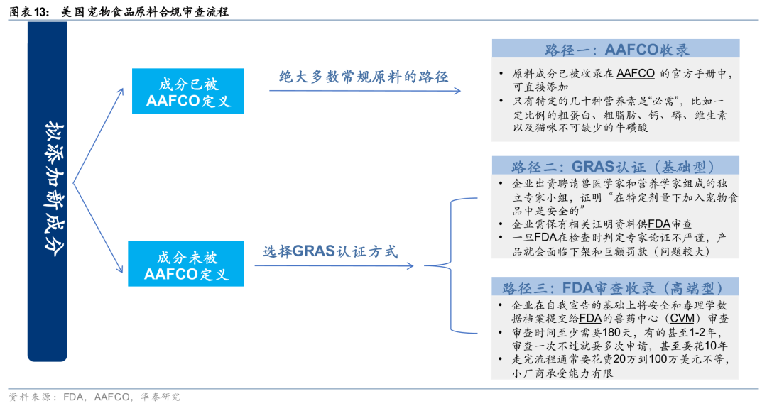 原料层面,企业不能随便向宠物食品里添加新成分,合法成分的来源有AAFCO收录、GRAS认证两种路径,其中GRAS认证分为基础型和高阶型两类申报策略。一、AAFCO已定义原料:成分已经被收录在AAFCO的官方手册中,这是绝大多数常规原料的路径,在这个标准内,只有特定的几十种营养素是“必需”,比如一定比例的粗蛋白、粗脂肪、钙、磷、维生素以及猫咪不可缺少的牛磺酸(Taurine)。二、如果原料没有被AAFCO收录,而生产商想要去添加该成分,就要去做GRAS认证(Generally Recognized As Safe),即一般公认安全。这主要分为基础型和高阶型两类申报策略:1)基础型申报是企业花钱聘请一个由兽医学家和营养学家组成的独立专家小组,来证明“在特定剂量下加入宠物食品中是安全的”,并保有相关证明资料供FDA审查,不过这种方式容易带来较大问题,一旦FDA在检查时判定专家论证不严谨,产品就会面临下架和巨额罚款。2)高阶型申报是企业在自我宣告的基础上将详尽的安全和毒理学数据档案主动提交给FDA的兽药中心(CVM)审查,但审查时间至少需要180天,有的甚至1-2年,有些原料在审查一次不过,就要多次申请,甚至要花10年之久。此外,走完一套严谨的FDA GARS的流程通常要花费20万到100万美元不等,小厂商承受能力有限。