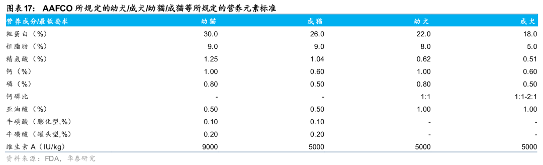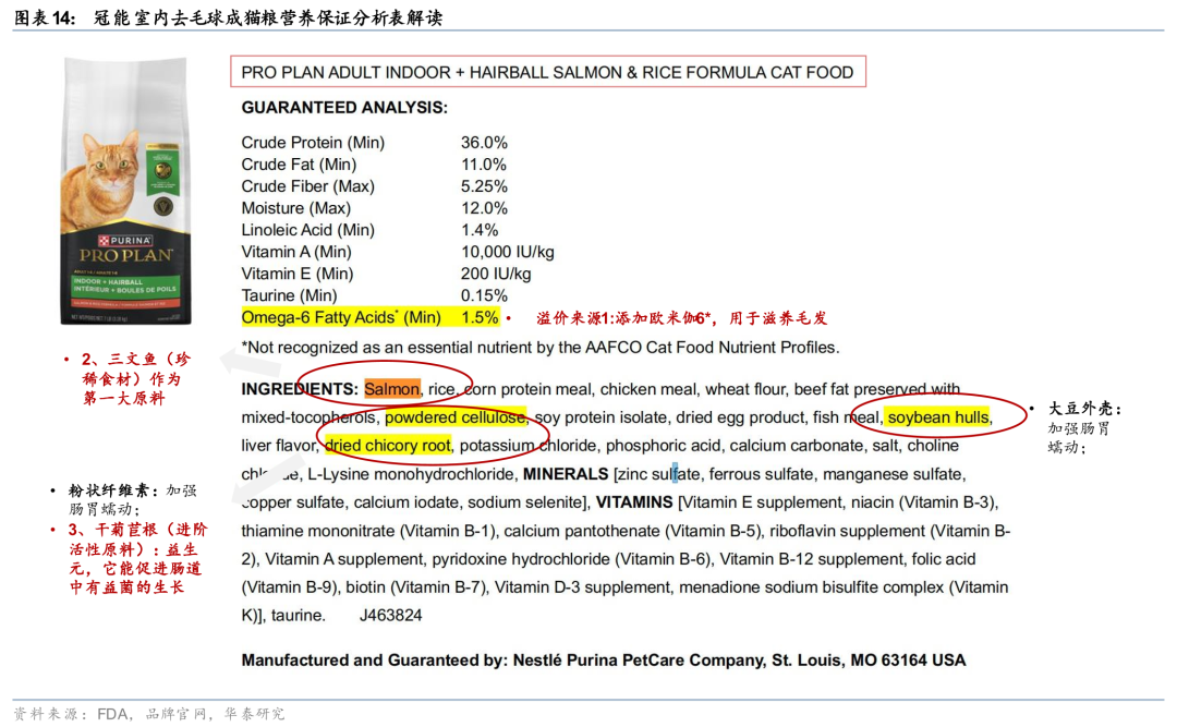 1)高准入门槛:行业实行“联邦与州双重监管、协会标准主导、重罚兜底”模式。处方粮需备双盲临床数据且仅能通过兽医渠道销售,功能粮需要符合AAFCO标准及营养验证分析。其中原料合规以AAFCO收录、GRAS认证(耗时1-10年)为核心,营养验证中高端品牌采用高成本AAFCO喂养试验及额外功效验证。违规将面临重罚甚至品牌强制退出风险。2)品牌溢价:核心取决于原料品质与功效论证严密性,原料等级越高、功效验证流程越严谨(如高端品牌采用专属菌株、精准配方及数据支撑),产品溢价越高。比如cat chow、purina one、pro plan的三款化毛球猫粮产品,三者都具备化毛球功效,但因为添加原料不同、化毛球原理不同,导致价格相差1倍。