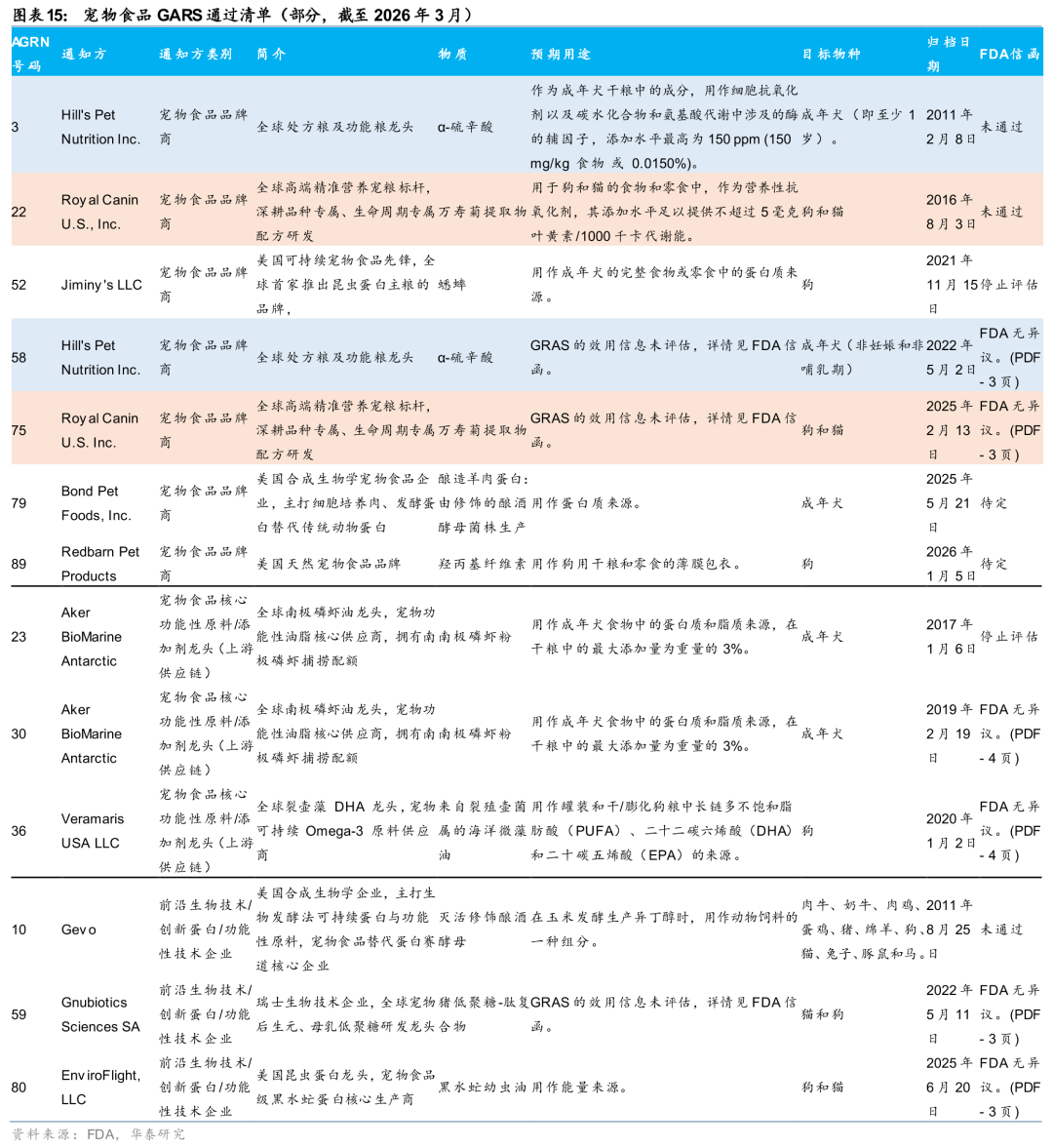 原料功效好坏是决定产品力及品牌力成功与否的关键,而且由于原料认证程序严格、耗时长,即使在美国,真正通过FDA的CVM试验的宠物企业也在少数。落实到具体产品中,一般宠物产品的配料表中分为被AAFCO收录,以及“不被AAFCO猫粮营养档案认可为必需营养素”(Not recognized as an essential nutrient by the AAFCO Cat Food Nutrient Profiles),即标星号(*)的成分,而这也是品牌溢价的部分来源。由于AAFCO 标准仅锚定了维持宠物生命运转的“基础生存底线”,所以品牌为了解决宠物健康痛点,往往会自愿投入高昂成本足量添加左旋肉碱、专利益生菌或氨基葡萄糖等进阶活性原料,用于解决减重、肠胃微生态调节、关节呵护等问题。原料的稀缺度在某种程度上决定了一定品牌溢价,比如雀巢冠能的一款化毛球粮(单价4.01美元/磅),因为添加了菊苣根(Chicory Root,天然益生元)、三文鱼(富含 Omega-3),价格是cat chow同款产品(1.92美元/磅)的2倍。但功能性原料并非是盲目添加,都要通过GARS验证,绝大多数品牌会采取自我宣告的GARS(Self-Affirmed GRAS),只有少数企业及大型原料厂商会向FDA提交GRAS 通知。据美国FDA GARS指标网站公布的“当前动物食品公认安全(GRAS)通知清单”,一共23家企业提交原料认可申请,其中宠物食品品牌商有5家,宠物食品核心功能性原料 / 添加剂龙头如帝斯曼、Aker等共9家、前沿生物技术/创新蛋白/功能性技术企业共9家。在5家宠物食品公司中,只有皇家、希尔斯递交的万寿菊提取物、α-硫辛酸通过了FDA认证许可,并且二者各花费了9年、10年,小厂商成本承受能力有限。