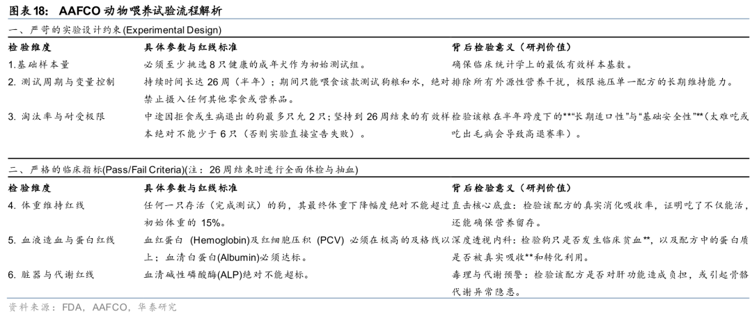 二、动物喂养试验法(Animal Feeding Tests):按照AAFCO规定的严格临床喂养协议,找一批真实的猫狗进行为期数月的喂养测试,通过各项血液和生理指标验证。我们以“成年犬粮”为例进行分析,即必须至少挑选8只健康的成年犬作为测试组。测试周期为整整26周(半年),在这半年里,这8只狗只能吃这一款测试狗粮和水,绝对不能吃任何其他零食或营养品,如果狗因为觉得难吃而拒食,或者中途生病退出了,最多只允许2只掉队。如果坚持到26周结束的狗少于6只,实验直接宣告失败。在26周时间结束后,必须对狗进行全面的体检和血液生化分析,来看实验狗体重有没有暴跌(下降超过15% 直接不合格)、有没有严重的临床贫血(测红细胞压积、血红蛋白)、血液生化指标(如白蛋白、碱性磷酸酶)是否在正常范围内。只要其中一条不满足,该配方就不合格,若合格,则对应宠物粮的营养因素保证性声明则将有“Animal feeding tests using AAFCO procedures…”(“采用美国饲料管理协会(AAFCO)程序进行的动物饲养试验……”)。该方式用时时间长、且成本高,若外包给行业的临床研发机构(CRO)做一次AAFCO基础喂养试验,单款SKU的硬成本在5万到15万美元之间,算上时间成本极高。一般冠能、希尔斯等具备自身研发实力的高端品牌都会采用该方式来加强验证。