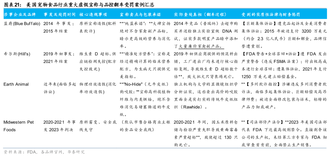 综上,我们认为美国宠物食品市场的审核呈现“流程规范、宽进严出、重罚兜底”的特征,以上在一定程度抑制了宠物食品企业进行盲目的成分添加,进而避免了功能粮的大规模泛滥。严格且标准化的原料合规性规范,以及营养学分析试验流程构筑成美国宠物食品企业的准入壁垒。FDA 的强制召回权(Recall)与停产法令(Consent Decree),配合极其成熟的消费者集体诉讼(Class-Action Lawsuit)机制,使得企业任何在配料表上的投机取巧或功效上的虚假夸大,都将面临动辄千万美元计的财务重创乃至品牌清零。以上避免了美国宠物食品市场功能粮的大规模泛滥,同时更强调了研发的重要性,这是企业能做出差异化的重要来源。