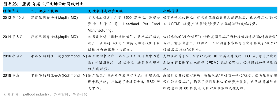 美国宠物食品行业监管严格,违法违规成本极高,若涉及虚假宣传,企业将会面临几千万美元甚至以上的巨额财务赔偿,甚至有品牌清零风险。历史上如蓝爵、希尔斯、Earth Animal、Midwestern Pet Foods等均涉及过大大小小的虚假宣传案件。其中如蓝爵2015年因竞争对手投诉原料造假赔偿3200万美元高额和解金,导致2015年公司净利润同比下降12.3%至8900万美元。甚至像Midwestern Pet Foods面临品牌清零、产品停产风险。值得注意的是,诉讼案直接推动了蓝爵的第二座工厂及研发中心建设。在诉讼案结案的次年,2016年9月蓝爵在印第安纳州开建第二座干粮工厂及研发中心,进一步摆脱对第三方代工(OEM)的依赖,收回品控权。