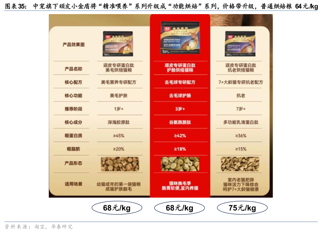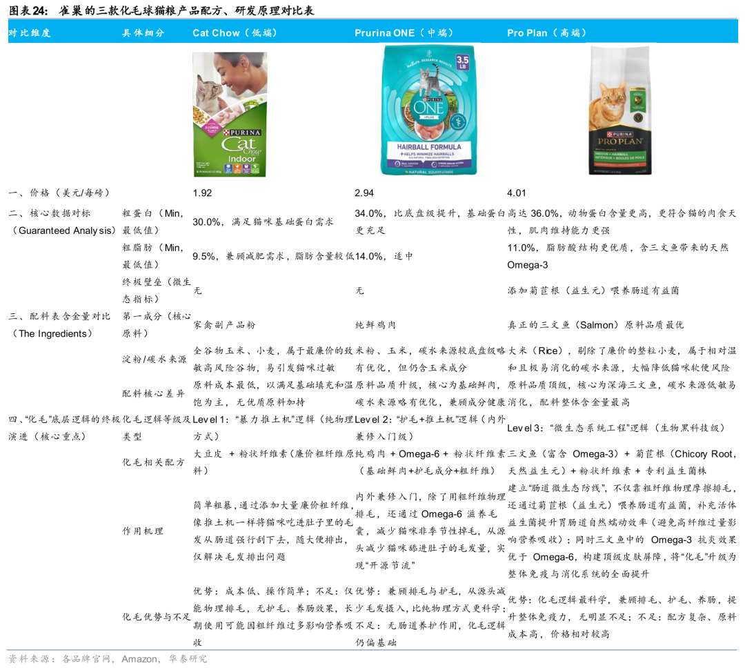 从品牌自身角度而言,原料越高端,配方越有效,论证方式越严密,即使是具备同一功效的功能粮,品牌也会有更高水平溢价。我们以cat chow、purina one、pro plan的同一款化毛球配方产品为例进行分析,三者都具备一定化毛球功效,但是因为添加原料不同,以及化毛球原理不同,导致价格相差1倍。cat chow以鸡肉粉为第一原料,且化毛方式为简单的大豆皮 粉状纤维素,而purina one、pro plan的第一原料分别为纯鲜鸡肉、三文鱼,并且在排毛的方式兼顾护毛,而且pro plan的化毛逻辑最科学,排毛护毛的同时还养护肠胃、提升自身免疫力。此外,某种意义上我们也可以认为,在一个公开透明、流程标准化的宠物食品市场中,消费者愿意为更好的原料、以及更严密的营养验证流程,即功能更突出、更有效的产品买单。