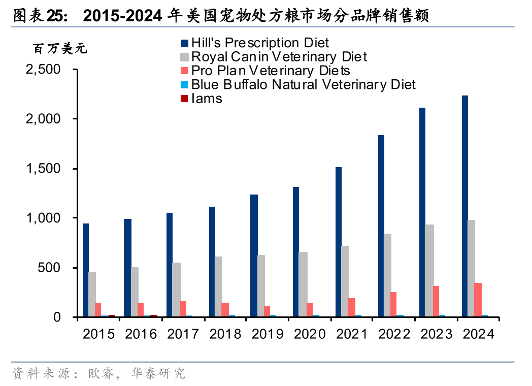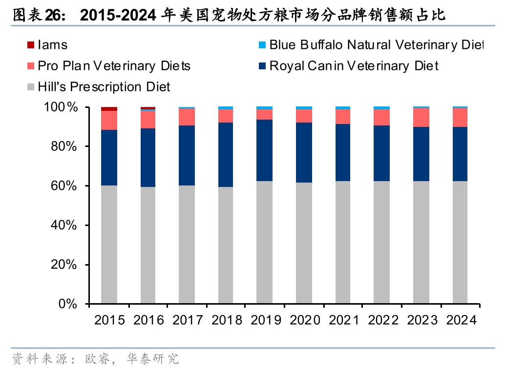 美国处方粮格局极其稳定,2024年希尔斯及皇家占据90%左右份额。据欧睿数据,2024年美国处方粮市场规模为35.9亿美元,其中希尔斯处方食品为22.3亿美元,占比62.3%;皇家处方食品为9.8亿美元、占比27.4%;冠能处方食品为3.4亿美元,占比9.6%;蓝爵处方食品为2677.8万美元,占比0.75%。希尔斯、皇家自2015年起在处方粮市场占比均在60%、30%左右,二者几乎垄断了美国处方粮市场。我们认为其背后的原因包括;1)处方粮研发投入高、回报周期长,多数小品牌难以承担研发经费以及时间成本,比如希尔斯的一款处方粮研发周期在十年左右;2)美国处方粮售卖场所监管严格,必须在宠物医院或者带处方审核机制的授权电商等地销售,希尔斯、皇家分别于1939年、1968年布局处方粮,进入市场时间早,在渠道端拥有坚实壁垒。