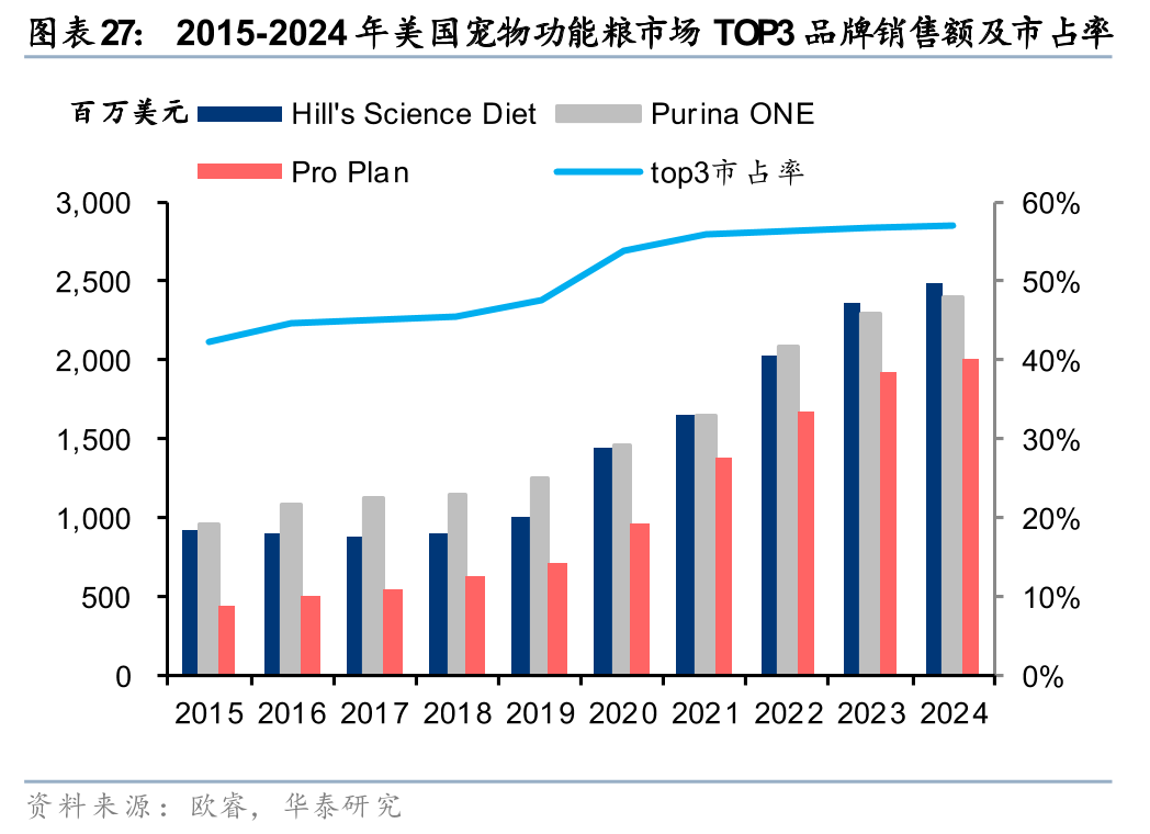 功能粮相对处方粮格局更加分散,2024年TOP3合计市占率为57.1%,原因是某些去毛球、减重粮等可以通过简单的方式实现,所以部分中低端品牌也会布局。相较于具备极高医疗壁垒的处方粮,美国功能粮市场的竞争格局呈现出相对分散的特征。据欧睿数据,2024年美国功能粮市场中市占率排名前三的品牌分别为希尔斯Science Diet(20.47%)、Purina ONE(19.93%)以及 Pro Plan(16.65%),TOP3 品牌合计市占率约为 57.1%。这一格局形成的核心原因在于功能粮细分品类间的技术门槛存在显著差异。部分基础功效(如去毛球、体重管理等)的实现路径较为简单,通常仅需通过增加廉价粗纤维或降低脂肪比例等粗放方式即可达成。这种较低的研发与制造壁垒,使得 Beneful(12.52%)、Pedigree(10.95%)等定位大众商超或中低端的品牌也能轻松入局并分流市场,从而在整体盘面上稀释了头部专业品牌的集中度。
