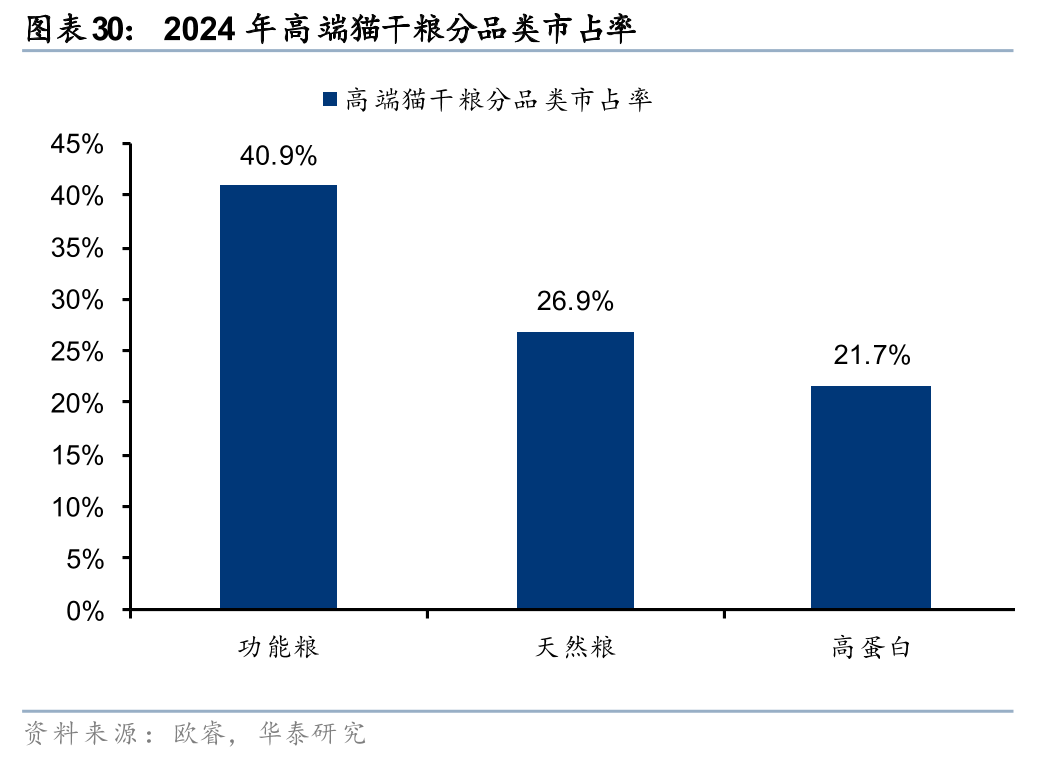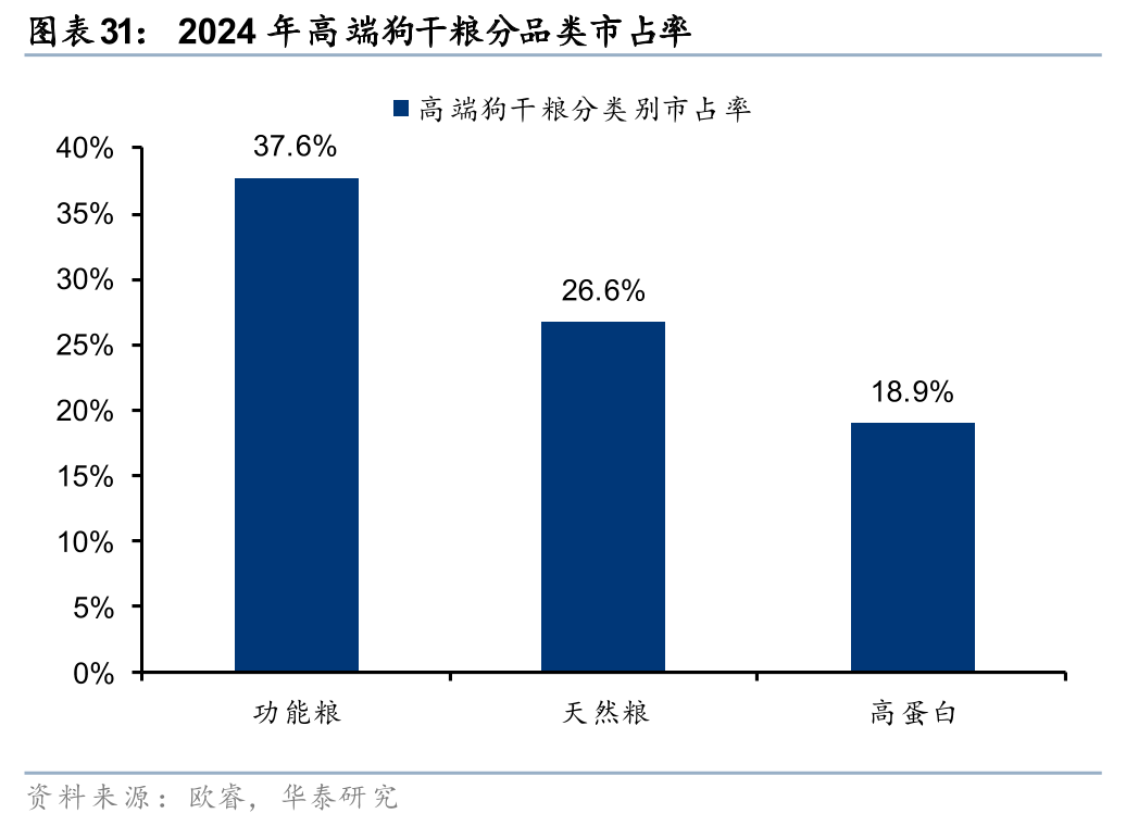 此外,功能添加是宠物食品产品的重要溢价来源。我们以猫干粮、狗干粮为例进行分析,发现在高端线中,食品往往拥有功能添加以及成分天然两大卖点,前者以普瑞纳、皇家为主,后者的代表则是蓝爵等。以2024年高端猫干粮、高端狗干粮为例进行分析,功能粮品牌市占率分别高达40.9%、37.6%,天然粮分别为26.9%、26.6%。
