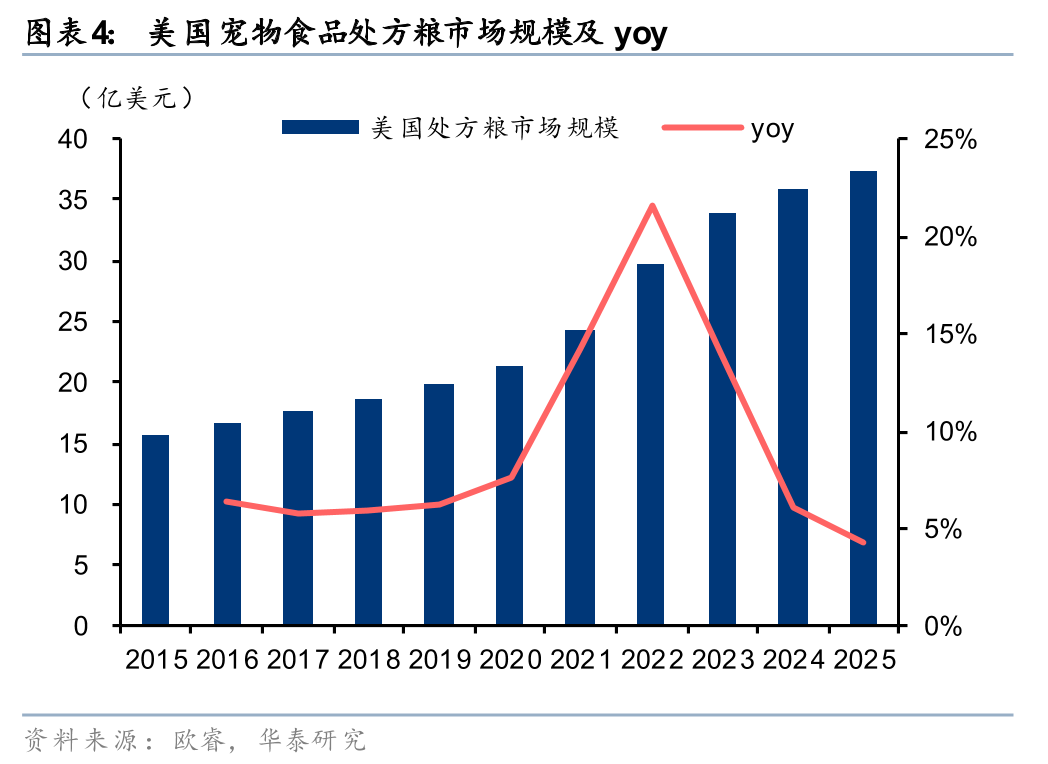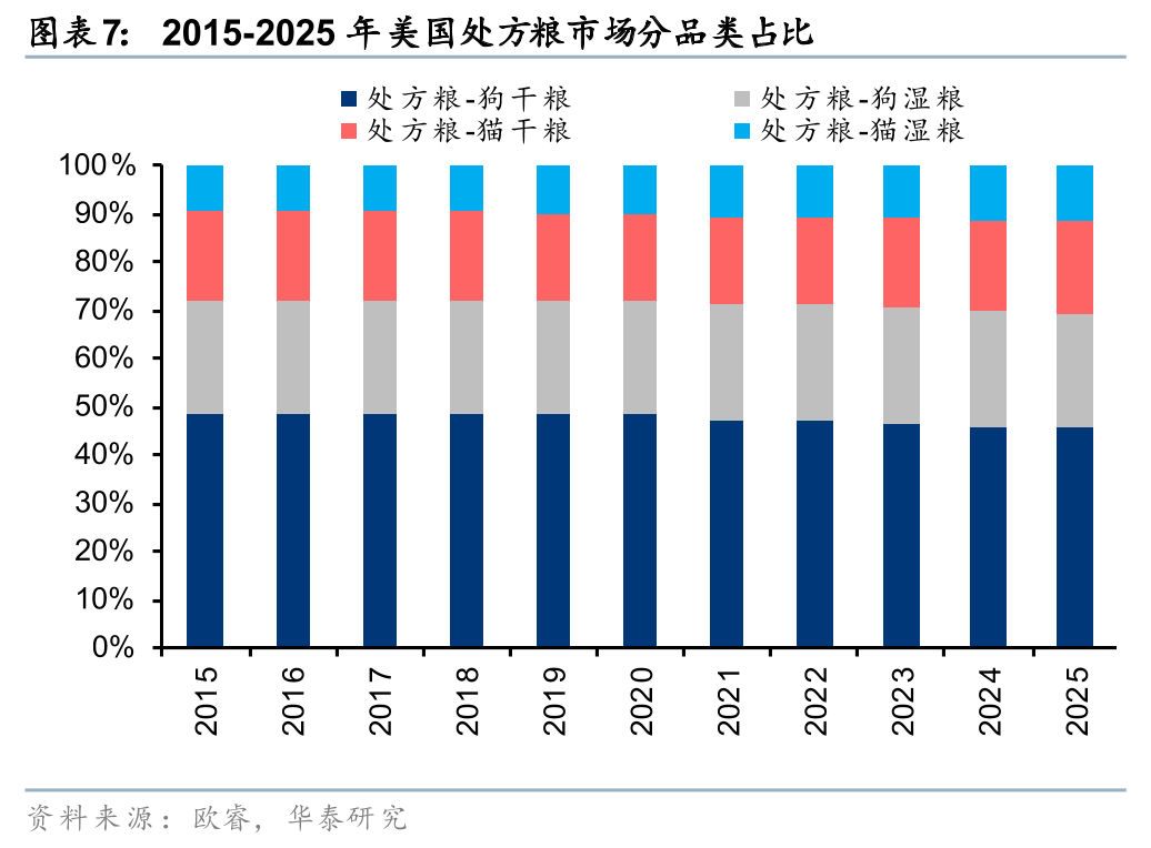 2025年美国处方粮市场规模为37.4亿美元,过去五年复合增速高达11.9%。美国处方粮市场正处于快速且稳定的增长期。据欧睿数据,2025年美国处方粮市场规模达到37.4亿美元,过去五年的复合增速高达11.9%,整体增速显著高于美国宠物食品市场增速2.0pct。这表明,随着科学养宠观念的普及,消费者越来越愿意为患有特定疾病(如泌尿系统、肾脏或心脏疾病等)的宠物购买专业的医疗配方粮。宠物处方粮占整体宠物食品市场规模比例持续提升,从2015年的6.8%提升至2025年的8.0%。